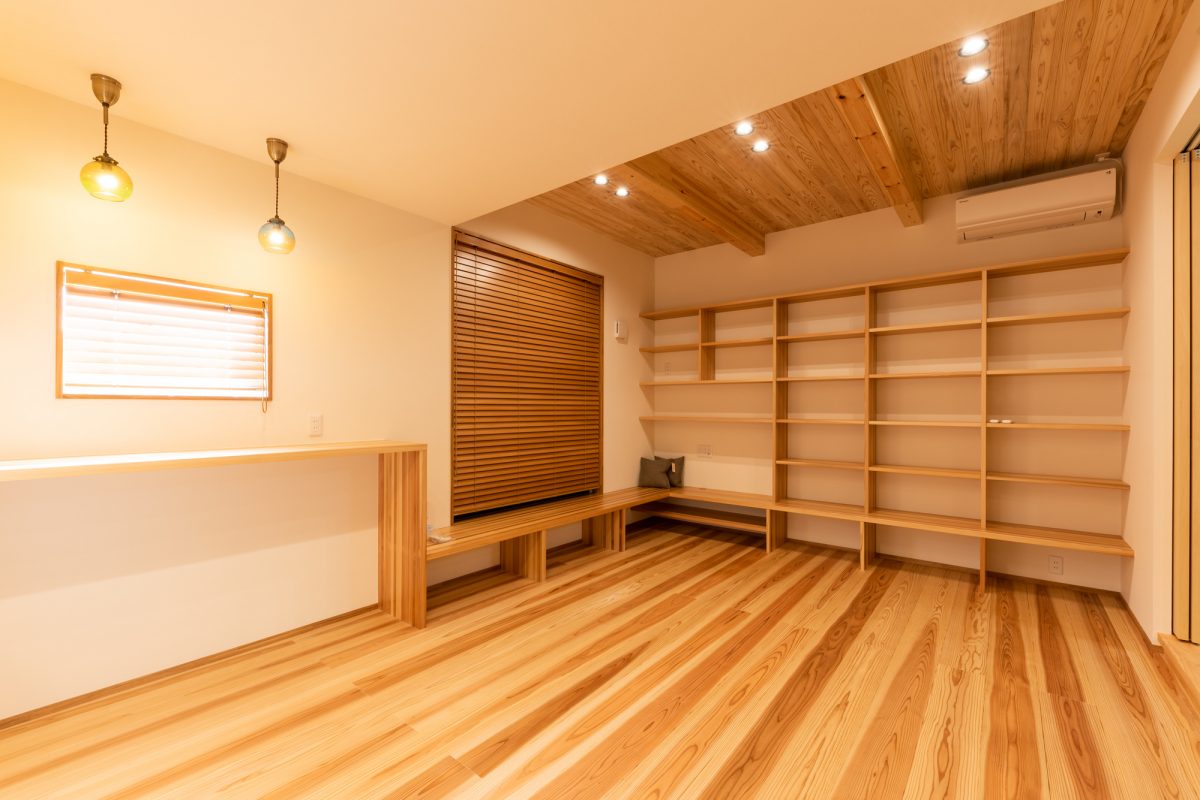 LDKの床材はスギの無垢フロアを使用し、リビングの天井部分も同じスギの羽目板張りとなっています。