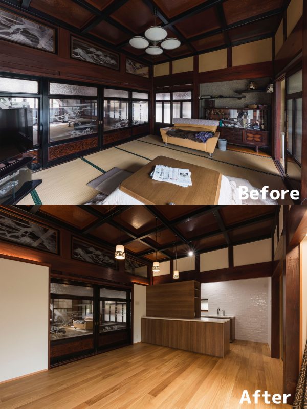 既存の格天井、欄間、建具、庭への眺めが美しく、お客様の思い入れが詰まっているためそれらを活かしつつ、畳敷きの床座生活からテーブルの椅子座生活に転換するためフロアー貼りにリフォームしました。